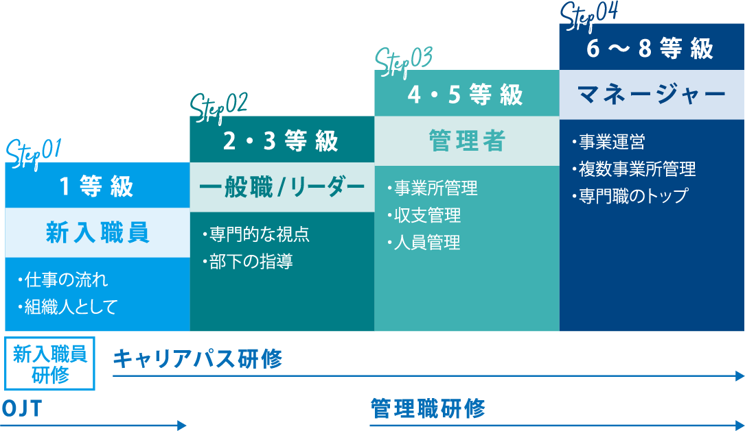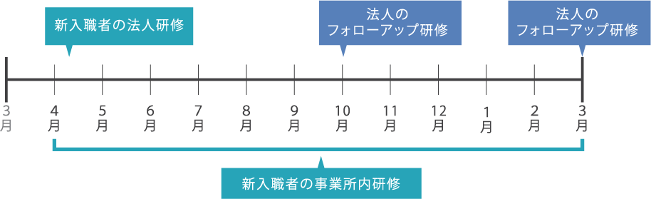 入職すると新人研修から始まり、初年度には定期的にフォローアップ研修を行っています。 また、配属された事業所内での研修では、実務を通しての研修にも力を入れています。